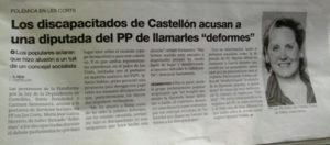 La noticia que refleja la prensa castellonense es la siguiente: “Las Plataformas por la ley de la Dependencia de la provincia de Castellón, Sonia Fernández y Carmen Santamaría, acusan a la portavoz de Servicios Sociales del Partido Popular en las Corts, Maria José Garcia Herrero, de haber llamado “deformes” a los discapacitados durante el debate parlamentario que tuvo lugar sobre el reciente copago farmacéutico para este colectivo. Y es que ambas representantes estuvieron en el palco de Les Corts, invitadas por el portavoz en materia sanitaria del PSPV, quién presentó una propuesta para derogar este pago entre los menores discapacitados que, posteriormente, los diputados populares rechazaron. “Me he puesto a llorar cuando he oído la palabra deformes, me he sentido ofendida, porque mi hijo es discapacitado, es una vergüenza que haya hecho esta alusión”, señaló Fernández. “Nos hemos sentido muy atacados y disgustados, porque ha estado fuera de lugar y desafortunada al intentar defender lo indefendible”.