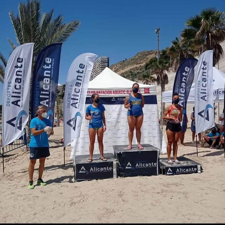 Rebeca Cabanes, nadadora del Club Natación Villena se proclamaba campeona en su categoría de la Travesía de la Cantera de Aguas abiertas celebrada este pasado domingo en la playa de la albufereta. Prueba que consistia en un circuito balizado de ida y vuelta entre las playas de la albufereta y la del postiguet, con 4000 m. de recorrido, donde Rebeca se alzaba con la primera posición.