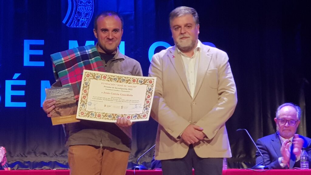 Después, el catedrático de la Universidad de Alicante, Mauro Hernández presentó el libro del trabajo ganador del Premio de Investigación José María Soler en la modalidad Científica y Humanística del villenense, Jesús García Guardiola, “Ganadería, patrimonio y trashumancia en Villena: la Cañada real de Almansa al Collado de Salinas“. Hernández alabó el trabajo de Jesús Guardiola ya que ha rescatado los vestigios de una actividad que está a punto de desaparecer, hablando con sus protagonistas, pateando el terreno y recopilando fotografías de la actividad. “La trashumancia se inicia en la Prehistoria y Villena se convierte en un punto estratégico, una parada obligada donde descansan los animales y también donde se hacen intercambios, porque hay agua, sal y pastos. De ahí, que la relación de este territorio con la ganadería explica la aparición de un tesorillo, objetos de marfil y de 10 kilo de oro en objetos singulares”