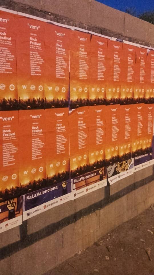El concejal socialista, Fulgencio Cerdán, desde su cuenta de Facebook alertó ayer que la concejalía de Cultura, había pegado carteles publicitando el evento VEM (Villena es música) sobre la cartelería electoral Unidos Podemos y Ciudadanos, ubicados en un espacio electoral
