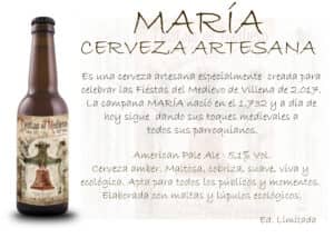 MARÍA es la cerveza de este año, una cerveza cobriza, suave, maltosa, viva y ecológica. esta cerveza nace pensando en María, la campana de la Iglesia de Santa María del 1.732, y que a día de hoy, aún sigue dando sus toques a todos sus parroquianos.