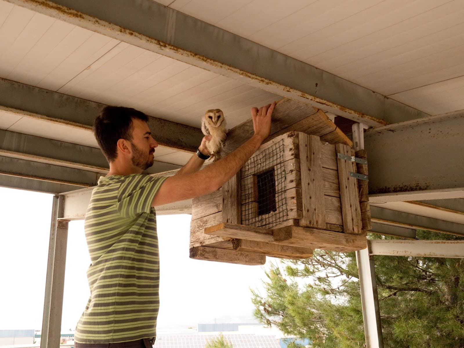 Otro de los factores que está influyendo en la desaparición de las lechuzas en el territorio es la pérdida de espacios adecuados donde criar. Para favorecer esta situación se destina parte del proyecto a la fabricación de cajas-nido con unas dimensiones y características específicas para lechuza. Las cajas son colocadas en lugares que consideramos favorables para su ocupación de forma natural, principalmente sobre infraestructuras abandonadas, próximas a terrenos abiertos como la huerta de Villena.