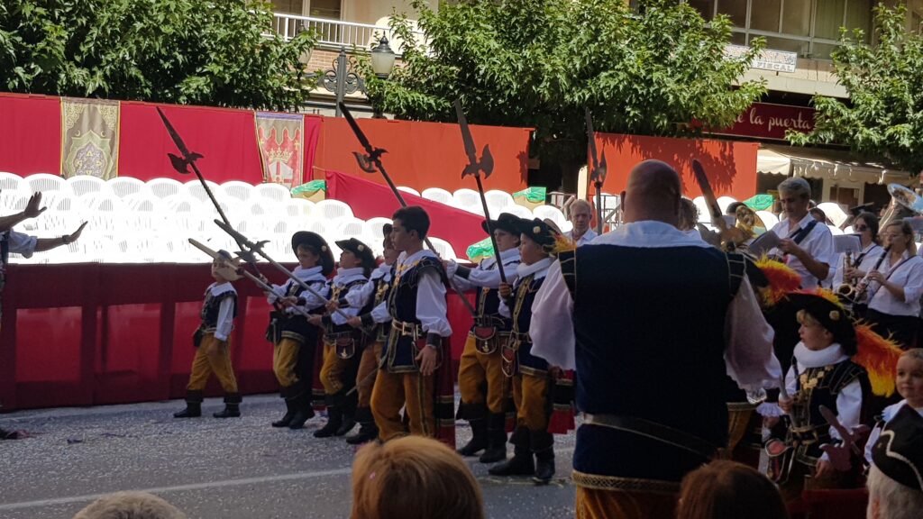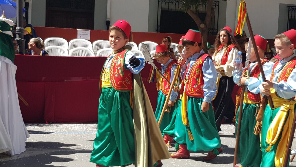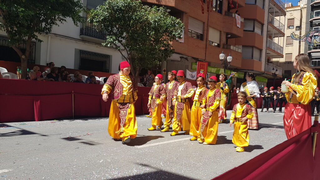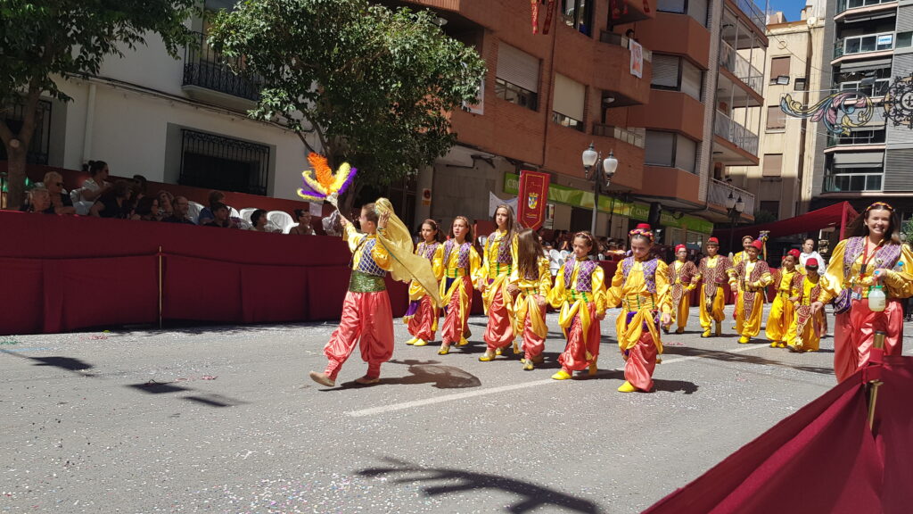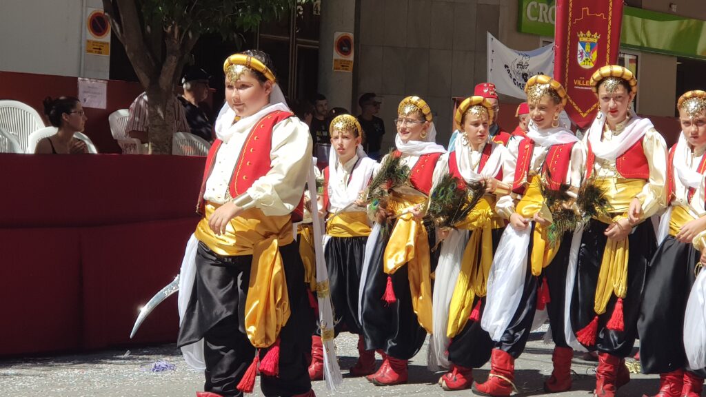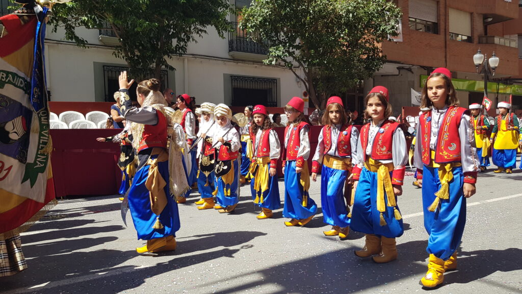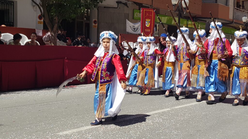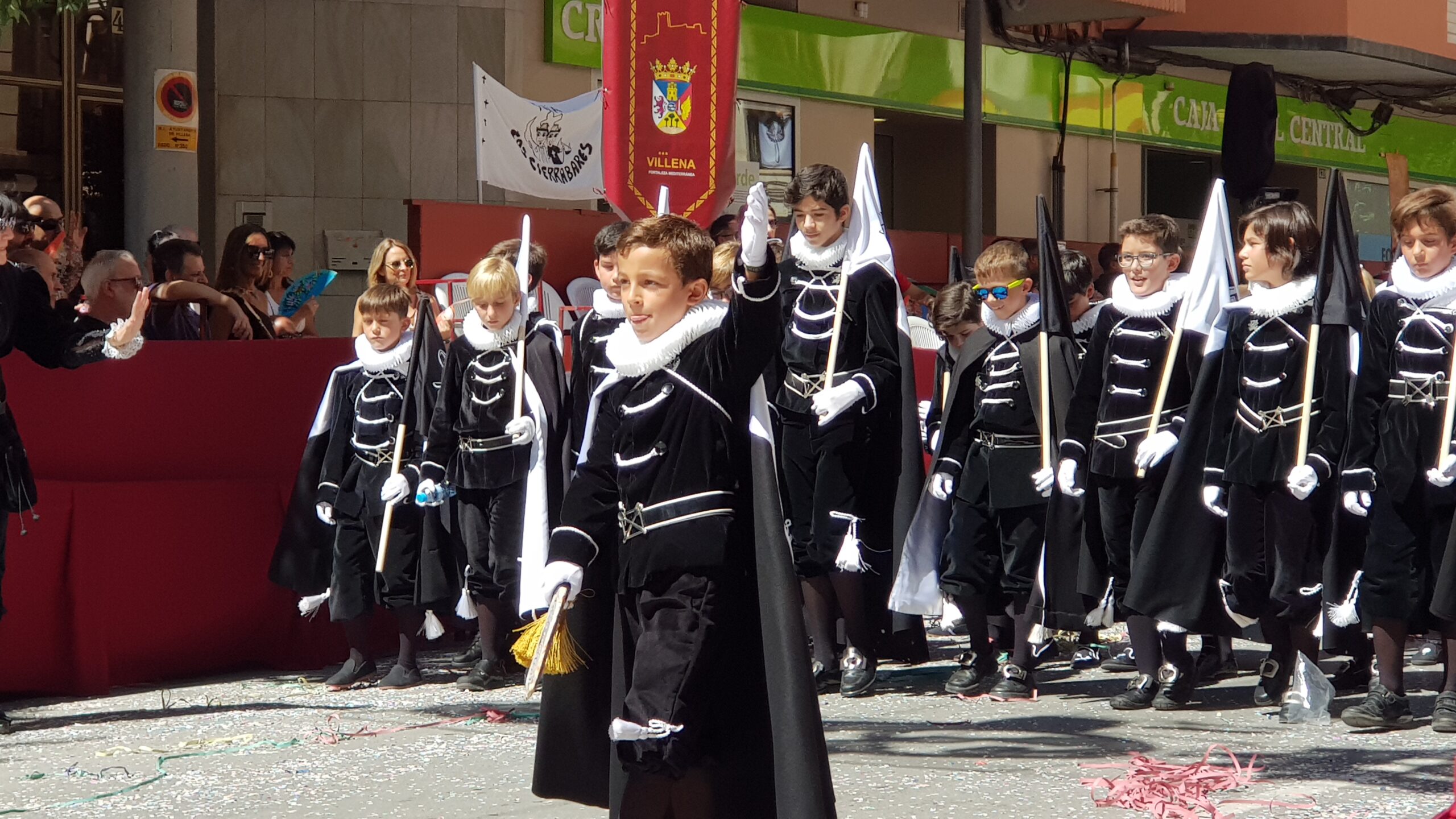 Así, abrió el desfile desde las inmediaciones de la plaza de María Auxiliadora la Regidora Infantil, Diana Navajas, acompañada de los Embajadores Infantiles, y la Banda Juvenil de Música de Villena. Después fueron los jóvenes festeros de la comparsa de Moros Viejos- la primera del bando moro, con la alegría del pasodoble, los que se abrieron paso por la avenida Constitución. Tras ésta, el saber hacer de los niños de las comparsas de Moros Nuevos y Bando Marroquí. Después fue el turno de los Moros Realistas, desfilando a marcha mora. Tras ellos, la comparsa de Moros Nazaríes, con un boato precediendo a los jóvenes festeros, y después los Moros Bereberes. Los Piratas, con su alegría desbordada al son de pasodobles, cerraron el bloque del bando moro.