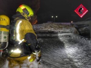 A las 00.34 de hoy los bomberos daban por extinguido el incendio donde se quemó la bañera de aluminio, es decir el recinto del camión donde viaja la mercancía. Debido al tipo de incendio y al material que contenía el camión el incendio se tuvo que apagar inundando la bañera con espuma.