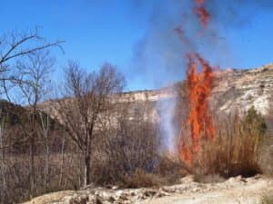 Continuamos por el camino que sigue el curso del rio por el lado izquierdo en su cara sur, disfrutando de la belleza del cañón del Júcar . Ya cerca de nuestro destino, a tan solo unos 2,5 km de Alcalá del Júcar, la tranquilidad de la mañana se vio interrumpida por un incendio que se produjo en la misma orilla. Mientras nuestro compañero Salva reanimaba al lugareño afectado por los efectos del fuego, otros compañeros de Aviana intentaban sofocar el incendio al tiempo que llamamos al número de emergencias. Todo quedo en un susto, que podría haber tenido consecuencias mayores. Seguimos por el bonito recorrido, pero la mañana aún nos deparó otra interrupción, una compañera sufrió una caída y tuvo que ser atendida en el centro de salud de Alcalá.