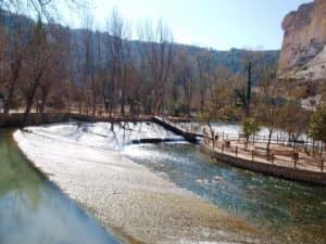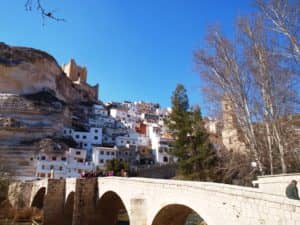 Después de caminar unos 16 km. llegamos a la turística población de Alcalá del Júcar, declarada Conjunto Histórico Artístico en el año 1982. Lo primero que se divisa es su castillo, fortaleza construida por los almohades en los siglos XII y XIII, que posteriormente perteneció al marquesado de Villena. También es de destacar las casas escalonadas y construidas en la roca como la cueva del Diablo, así como su singular plaza de toros. Comemos en la zona que se denomina la playa, frente a la rocalla y el Castillo. Y después realizamos una visita por el pueblo recorriendo sus estrechas y sinuosas calles.