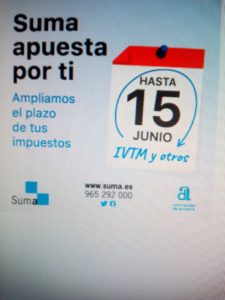 Debido al estado de alarma SUMA ha ampliado el período de pago para el Impuesto sobre Vehículos de Tracción Mecánica, vados y otras tasas. El plazo de pago se ha ampliado hasta el próximo 15 de junio. En los recibos que se están recibiendo estos días en los domicilios, emitidos con anterioridad desde SUMA, aparece como fecha límite el 8 de mayo.