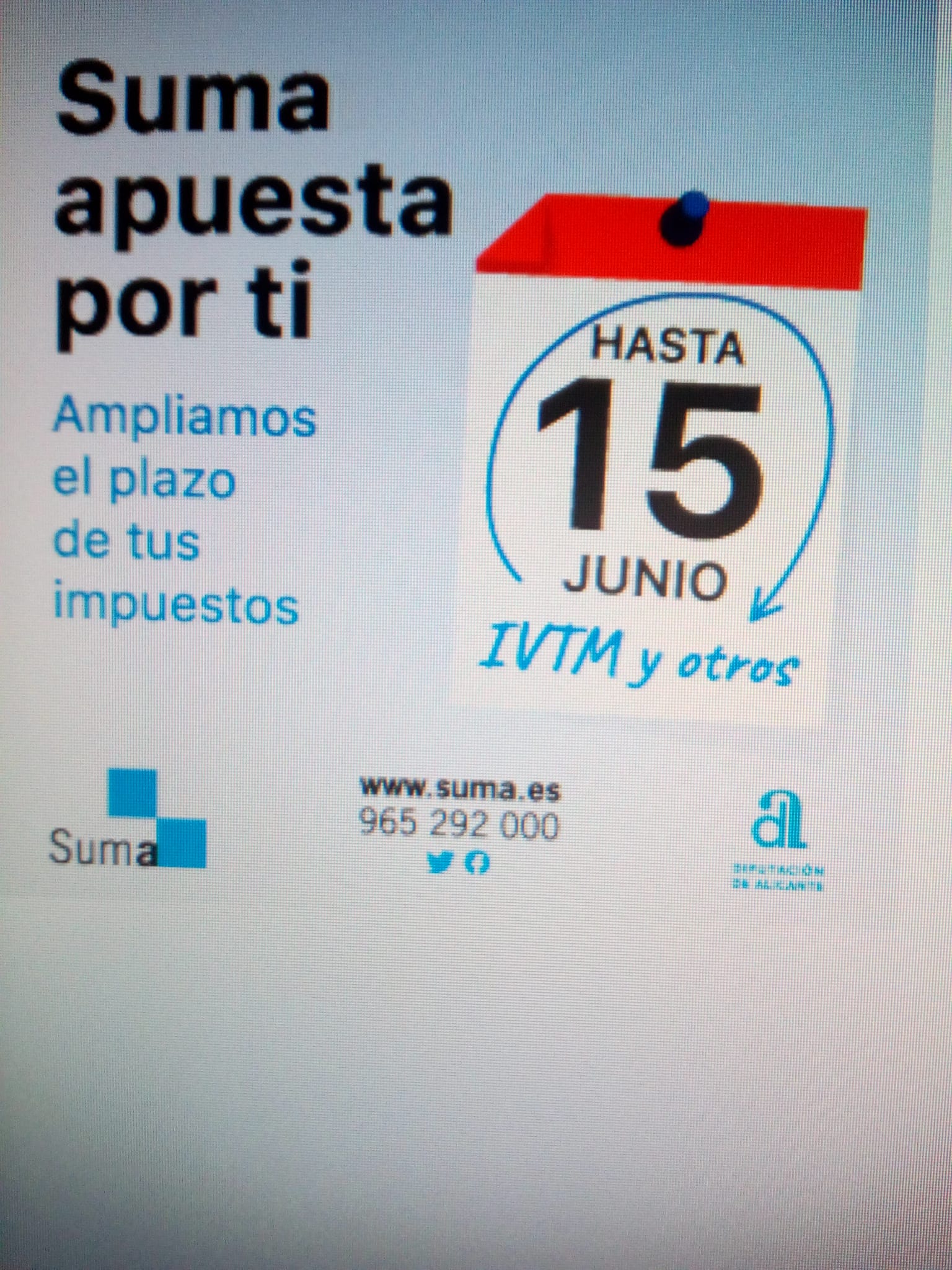 Desde SUMA Gestión Tributaria se informa a la población de la ampliación del plazo de pago de impuestos hasta el 15 de junio pese a que en los recibos emitidos aparezca como fecha límite el mes de mayo.