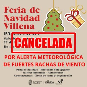 Ante la previsión meteorológica y los daños producidos por el viento en el arbolado durante la noche de ayer y primando ante todo la seguridad de los asistentes, las actividades de la feria de navidad de hoy domingo 22 de diciembre quedan suspendidas.