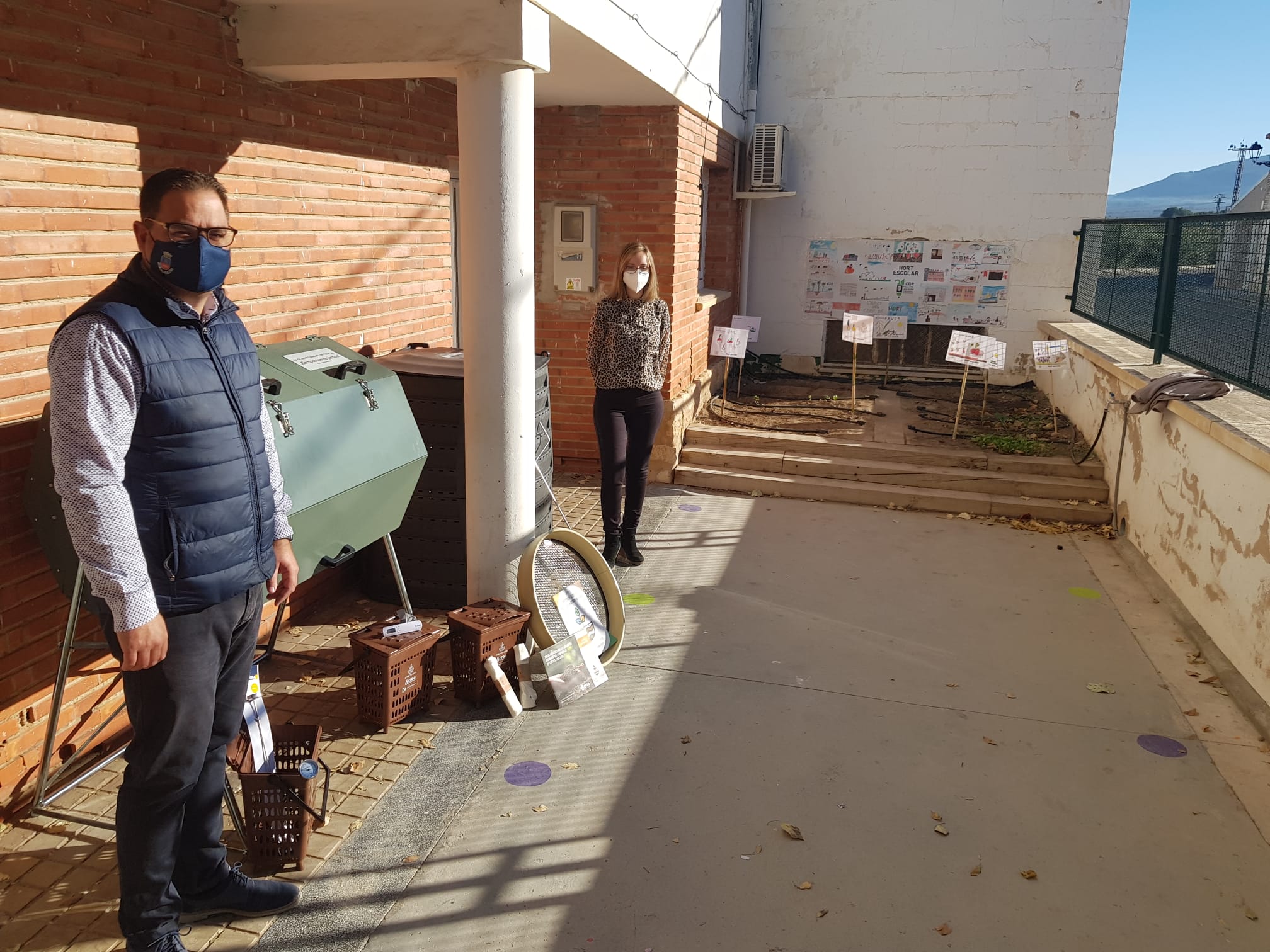 Los técnicos del Consorcio Crea, acompañados por el alcalde de Campo de Mirra y la directora del colegio Mestre Joaquín Cartagena, han iniciado el proyecto CreaCompost en el centro. Este
