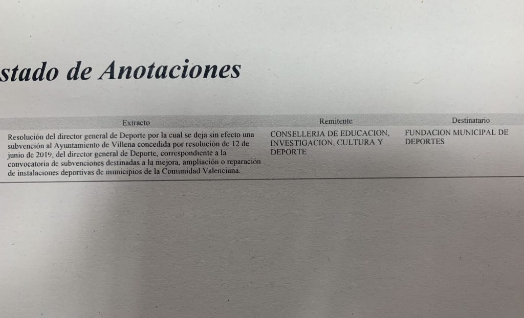 Ayer, 27 de enero, se remitió desde Consellería de educación, investigación, cultura y deporte la resolución del Director General de Deporte por la cual se deja sin efecto una subvención al