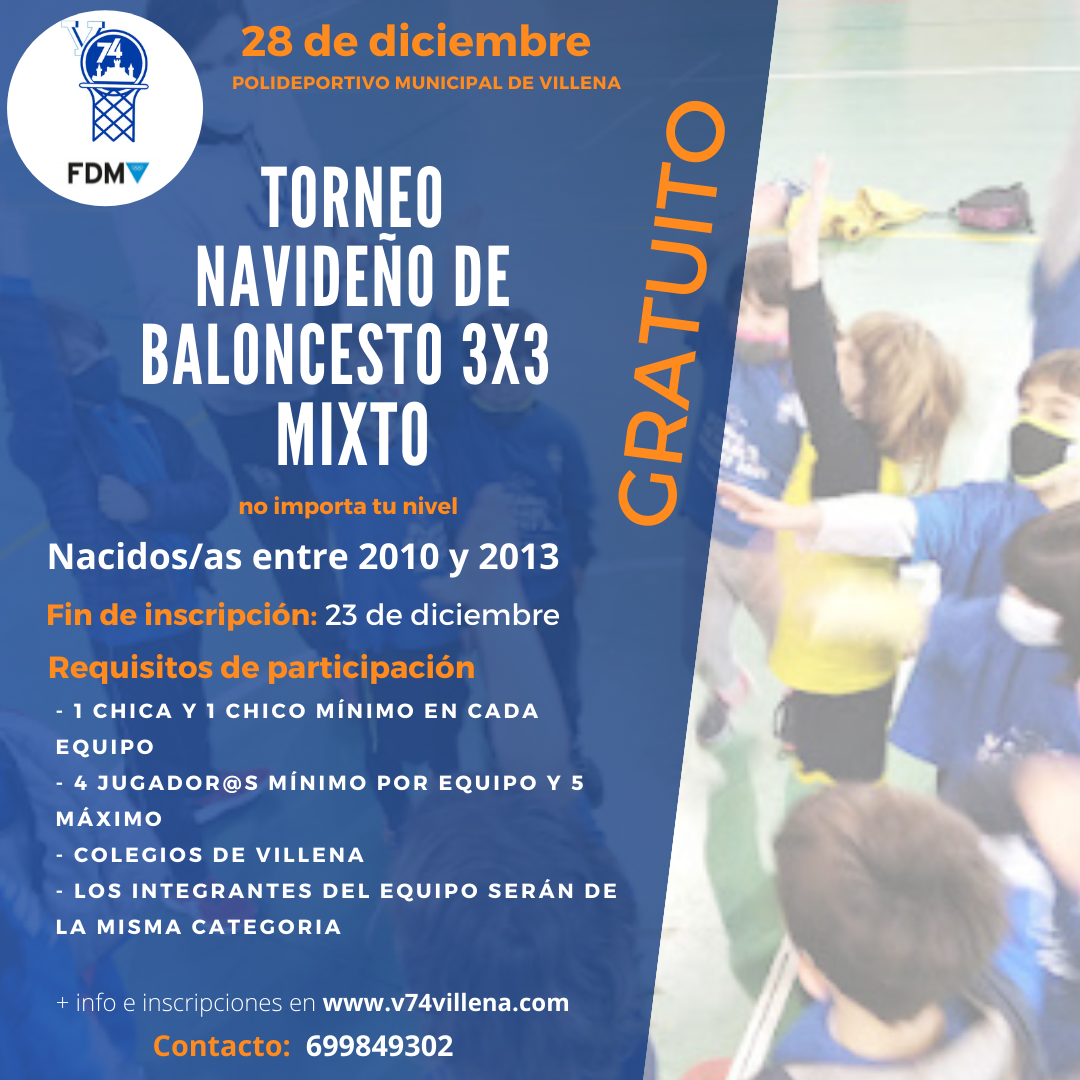 El club baloncesto V74 organiza el próximo 28 de diciembre un torneo de baloncesto 3×3 para niños y niñas nacidos/as entre 2010 y 2013.  El lugar del torneo será en