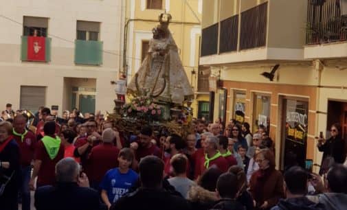 Centenares de villenenses acompañaron a la Virgen de las Virtudes, patrona de Villena, en su traslado desde la iglesia de Santiago hasta la de Santa María por calles del barrio