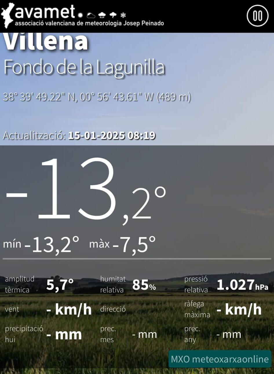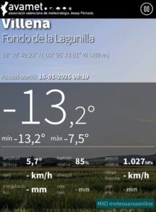Las heladas continúan en el interior de la provincia de Alicante. En el caso de Villena tras una noche gélida esta mañana se alcanzaban los – 5 grados. Sin embargo, en el Hondo de la Lagunilla, termino municipal de Villena, los termómetros han llegado a marcar los 13 grados bajo cero a las 8:15 de esta mañana.