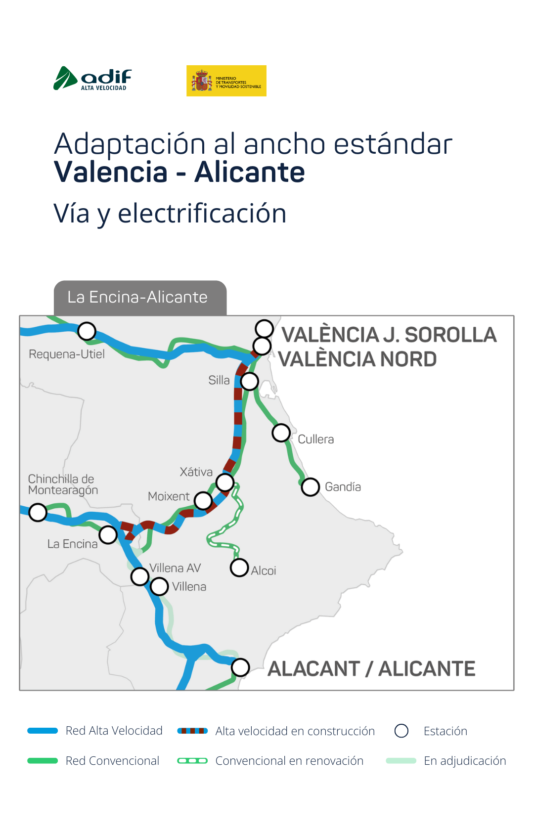Además, la renovación de la línea, que permitirá que circulen trenes de distintos anchos y propulsión eléctrica, repercutirá en una mejora de los servicios de media distancia Villena-Alicante y de cercanías Alicante-Sant Vicent de Raspeig, al reforzarse al fiabilidad y capacidad de la vía.