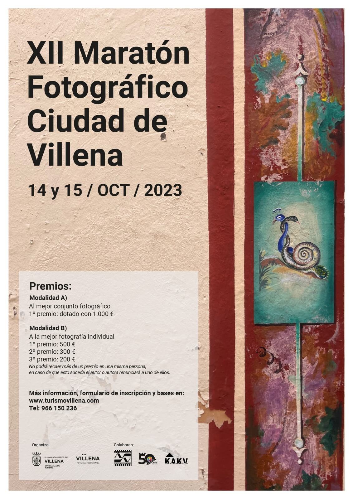 La Concejalía de Turismo ha publicado la convocatoria y las bases de la próxima edición del Maratón Fotográfico Ciudad de Villena 2023, que se celebrará entre el 14 y el 15 de octubre, que ofrece un primer premio valorado en 1.000 euros al mejor conjunto fotográfico. Las bases del concurso y el formulario de inscripción ya están disponible a través de la web https://turismovillena.com/. El 14 de octubre se podrán formalizar las inscripciones de manera presencial en la Oficina de Turismo de la plaza de Santiago, de 9 a 10 horas.