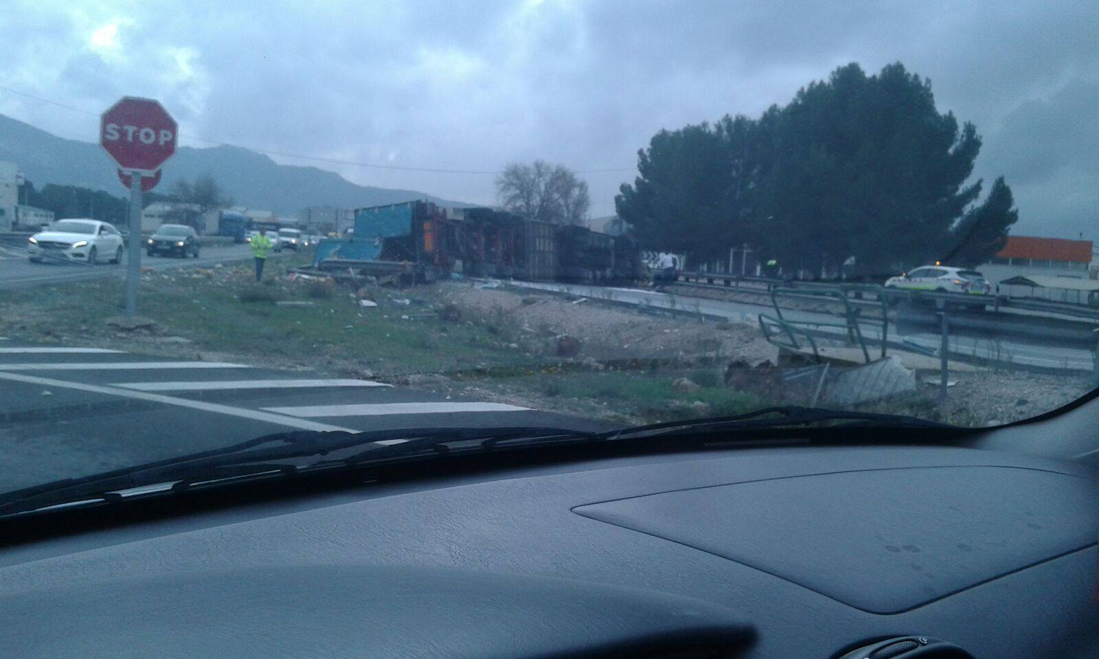 Poco antes de las 11:30 de la mañana, el 112 ha informado a los servicios de emergencias del accidente de un tráiler en la A-31 km. 185, indicando que en el interior de la cabina había una persona atrapada. De inmediato se han puesto en marcha los servicios de emergencia a la zona encontrándose con un tráiler que por causas que investiga la DGT, circulaba en sentido Alicante ha saltado la mediana y ha volcado completamente sobre el costado del conductor, interrumpiendo totalmente el tráfico en dirección Madrid.