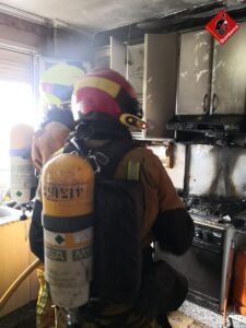 A las 12.20 efectivos del parque de bomberos de Villena se desplazaban a la calle Ferriz, 7 para sofocar un incendio de vivienda originado en la cocina, en el séptimo piso de un edificio de siete plantas.