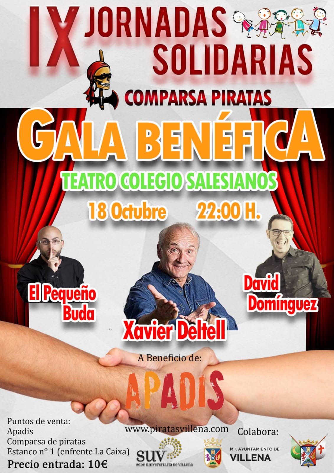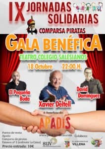 Esta última actividad que propone la comparsa tendrá como finalidad gratificar a la asociación APADIS, a través de una Gala Benéfica que tendrá lugar el próximo día 18 de octubre a las 22:00 horas en el Teatro del Colegio Salesianos y que contará con las actuaciones de tres conocidos monologuistas, xavier Deltell, El Pequeño Buda y David Domínguez.