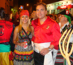 En el 2008 estuve en primera fila, desde el balcón de la abuela de mi marido en plena Corredera vi pasar las bandas, sentí ganas de romper en llanto cuando pasó la Virgen, por un momento me di cuenta que me sentía parte de Villena, de sus costumbres, quizá porque después de verlo tantas veces por la página de Intercomarcal TV y desde otro país, el directo superó mis expectativas. Comencé a imaginarme participando en los años siguientes en alguna comparsa, sin decidir todavía mi preferida, porque aún hoy tengo debilidad por los Contrabandistas, con su elegancia a la hora de desfilar, pero mi pasión por los Piratas es fuerte porque pertenecer a ella sería escribir dentro de mi familia una nueva historia que perpetúe la tradición, todavía recuerdo cuando mientras observaba el desfile la abuela de Jorge me hizo dar la vuelta para que viera a mi entonces novio salir de una habitación vestido de pirata, estaba feliz y orgulloso porque desfilaría y a su abuela no se le ocurrió otra cosa que contarme las anécdotas de las fiestas y fue de inmediato, me enamoré de los villeneros en general, del compromiso para estas fiestas y ya no hubo necesidad de que me explicaran porque eran tan especiales para el pueblo, la experiencia fue y es gratificante.