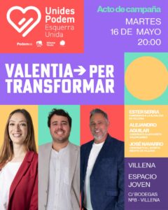 La confluencia Unidas Por Villena (conformada por Izquierda Unida, Podemos y personas independientes) presentará su programa electoral el próximo martes 16 a las 20h en el Espacio Joven. En dicho acto, Ester Serra y José Navarro (número 1 y 2 respectivamente) explicarán las principales medidas del programa trabajado por la confluencia de manera asamblearia.