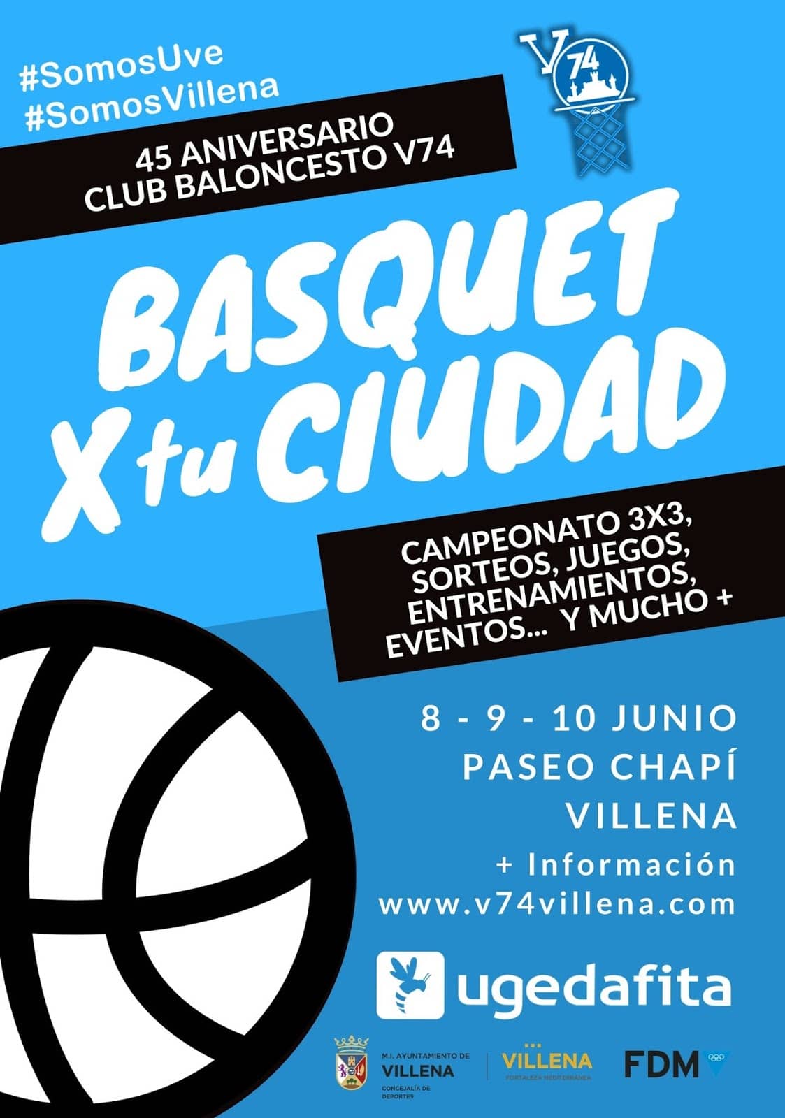 Empezaremos este 8/9/10 de JUNIO con la celebración del BASQUET X TU CIUDAD, acercando el baloncesto a pleno centro de Villena. Desde el viernes 8 por la tarde hasta la medio día del domingo 10, en el Paseo Chapí, habrán competiciones deportivas, entrenamientos con asociaciones de la ciudad, juegos de habilidad y tiro para los más pequeños, música y un gran ambiente. Animamos a cualquier persona que quiera acercarse y participar con nosotros de un finde lleno de básquet!