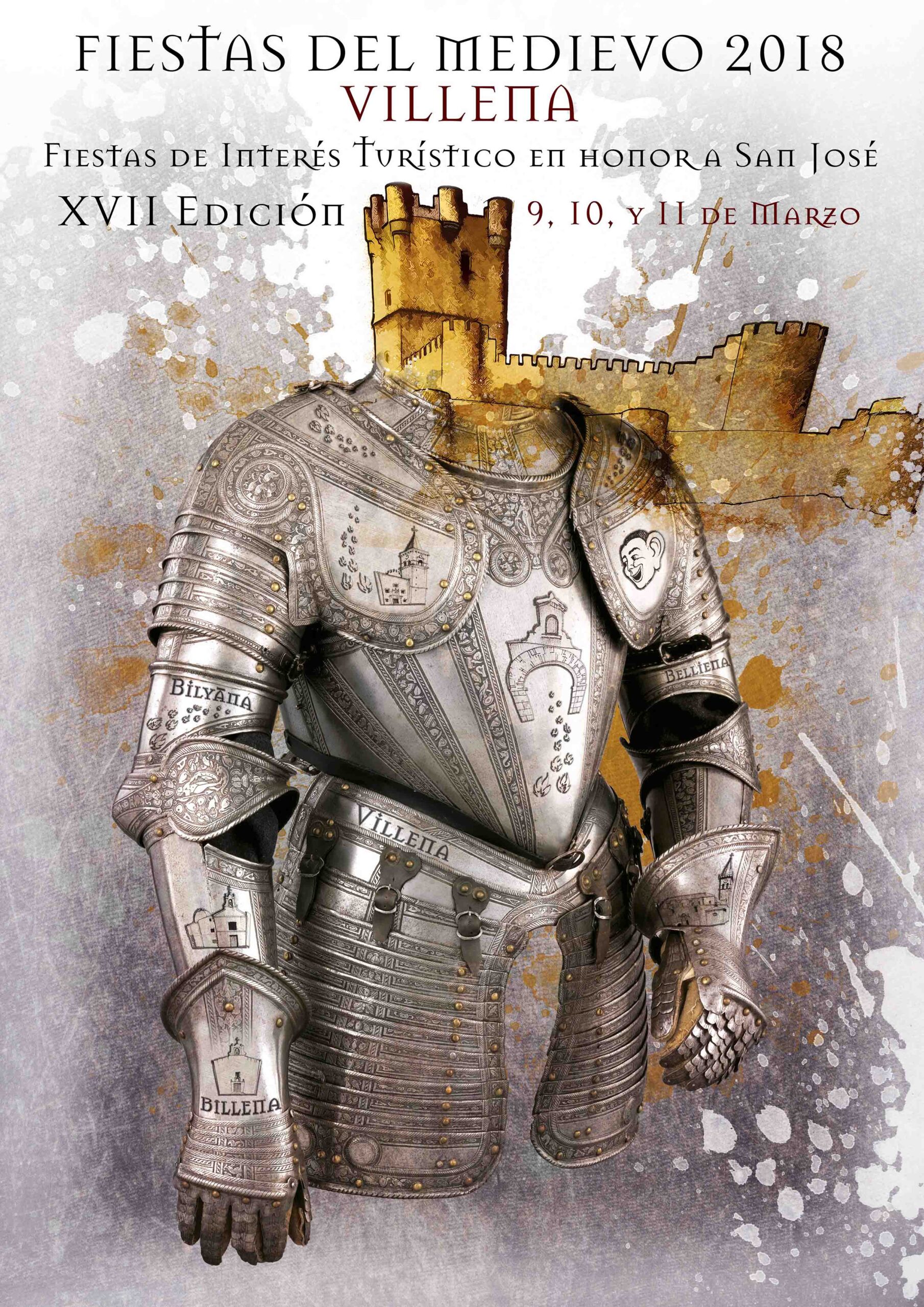 La obra de Miguel Ángel Bonilla, natural de Agullent, la encargada de anunciar las Fiestas del Medievo 2018. El cartel ganador de esta XVII edición del Medievo es una ingeniosa combinación del castillo de la Atalaya a la cabeza de una armadura. Además de la fuerza que transmite la imagen, fundamental en un cartel anunciador, podemos encontrar diversos detalles labrados en la armadura que hacen referencia a la historia de Villena.