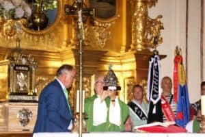 Villena celebró el Día de la Esclavitud, jornada que organiza la Junta de la Virgen y que renueva los votos de la ciudad a la patrona de Villena. En un santuario repleto de villeneros, el presidente de la Junta de la Virgen, Manuel Muñoz, se despidió de los dos sacerdotes que abandonan las iglesias de Santiago y Santa María, Ángel Bonavia y Efrén Mira para acudir a los nuevos destinos que se les ha encomendado desde el obispado de Orihuela. Después de más de una década en la ciudad desde la Junta de la Virgen se les dedicó palabras de cariño y les entregaron una imagen de la Virgen de Villena para que les acompañe. El párroco de Santiago recogió el regalo emocionado mientras que el nuevo cura de Santa María, José Cristóbal, tomó la imagen para entregársela a su compañero. Además el alcalde, Javier Esquembre, les dedicó palabras de cariño y les agradeció la labor que han realizado por la ciudad.