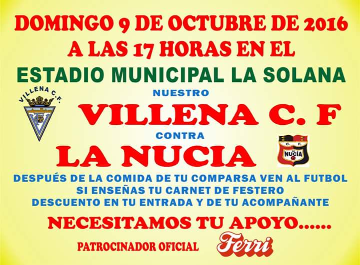 La junta directiva del VILLENA C.F. comunica de que con motivo del partido que va a disputar nuestro Villena C.F. frente a La Nucia C.F. el proximo domingo 9 de octubre a las 17 h en el Campo Municipal La Solana de Villena y aprovechando que todavia se celebran ese mismo dia alguna comida oficial de Comparsas de Moros y Cristianos de Villena, INVITAMOS de nuevo a todos los festeros de TODAS las comparsas de Villena que se acerquen al campo Municipal la solana a animar a nuestro Villena C.F. con un descuento especial en tu entrada y en la de tu acompañante, eso si presentando el carnet de socio de tu comparsa tanto en la taquilla como a la entrada al Campo.
