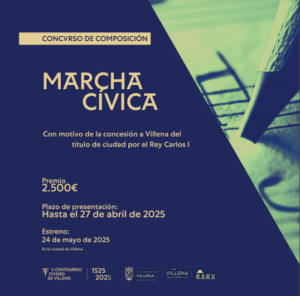 El Ayuntamiento de Villena ha convocado el Concurso de Composición Musical de la Marcha Conmemorativa del V Centenario del Título de Ciudad, que otorgó el rey Carlos I el 25 de febrero de 1525. El premio está dotado con 2.500 euros para la composición musical elegida por el jurado. Las composiciones deben ser presentadas antes del 27 de abril y se prevé su presentación en sociedad el 24 de mayo de este año, dentro de una de las actividades que desde febrero hasta noviembre celebrarán esta efeméride.
