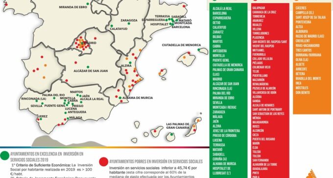 Por tanto, podemos considerar igualmente pobres en servicios sociales a los ayuntamientos con un presupuesto inferior al 60% de la media del gasto de los Ayuntamientos de más de 20.000 habitantes “, explican desde la Asociación Estatal de Directores y Gerentes de Servicios Sociales de España.