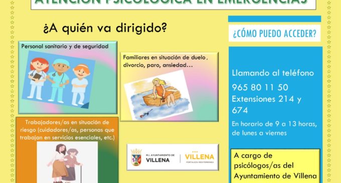 El Ayuntamiento de Villena pone hoy en marcha un servicio de atención psicológica para la Emergencia del Coronavirus con orientación y atención telefónica a personas afectadas por la actual crisis sanitaria.