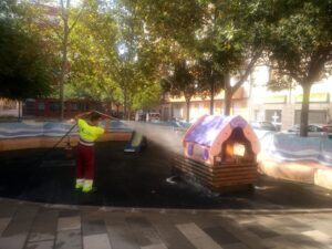 El servicio de limpieza continua con las labores que iniciara en el estado de alarma de limpieza y desinfección, de lunes a sábado, en vía pública, contenedores soterrados, juegos infantiles, mobiliario y dependencias municipales con una frecuencia mínima de tres veces por semana. Estos trabajos de limpieza utilizan agua a presión tras la aplicación de agua hiperclorada, desengrasantes y bactericida.