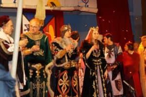 El acto inaugural de las Fiestas del Medievo escenifica la visita que realizaron los Reyes Católicos a Villena, en 1488 en su viaje desde Valencia a Orihuela. Los monarcas decidieron parar en la población y solicitar hospedaje. Entonces se reunió el  consejo de la ciudad y acordó no permitir que pernoctaran si no cumplían las promesas realizadas tras la rebelión de los villeneros contra el Marqués de Villena y a favor de los reyes. El humor estuvo presente en la representación, cuando en varias ocasiones se aludió a la falta de pago de los mercaderes “como algo habitual en la población”. Finalmente, el acuerdo entre concejo y Reyes se selló con un vino fondillón característico de esta zona.