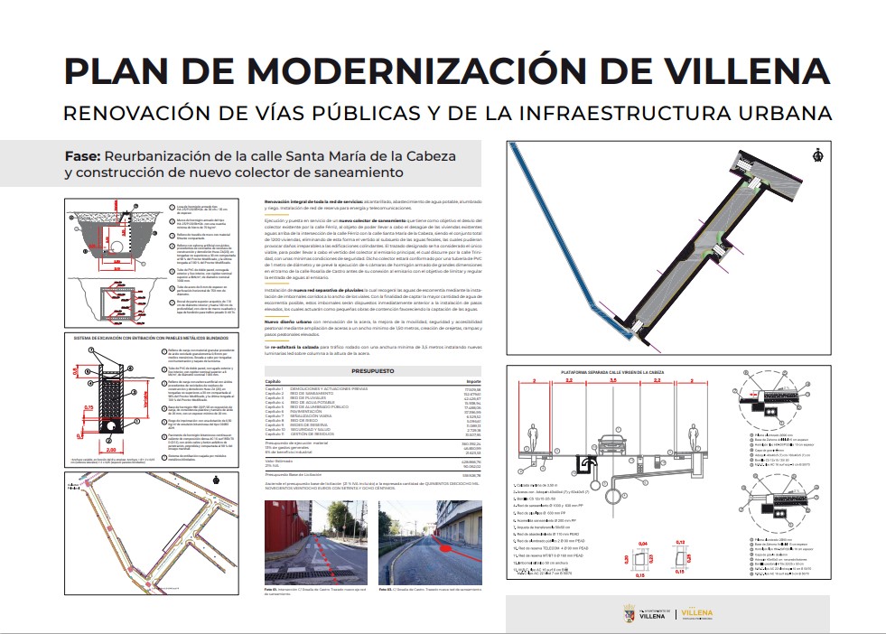 El Ayuntamiento de Villena ha iniciado hoy las obras de ‘Reurbanización de la Calle Santa María de la Cabeza y Construcción de nuevo Colector de Saneamiento’ que supondrá la renovación integral de la red de agua de abastecimiento y de residuales. Estas obras, cuya inversión asciende a 518.000 euros, supondrá el corte del tráfico por obras en la calle Rosalía de Castro, en el tramo comprendido entre calle Compositor Manuel Carrascosa y el paso a nivel de la calle Trinidad y en entre ésta hasta el tramo comprendido entre el paso a nivel y calle Madrid.