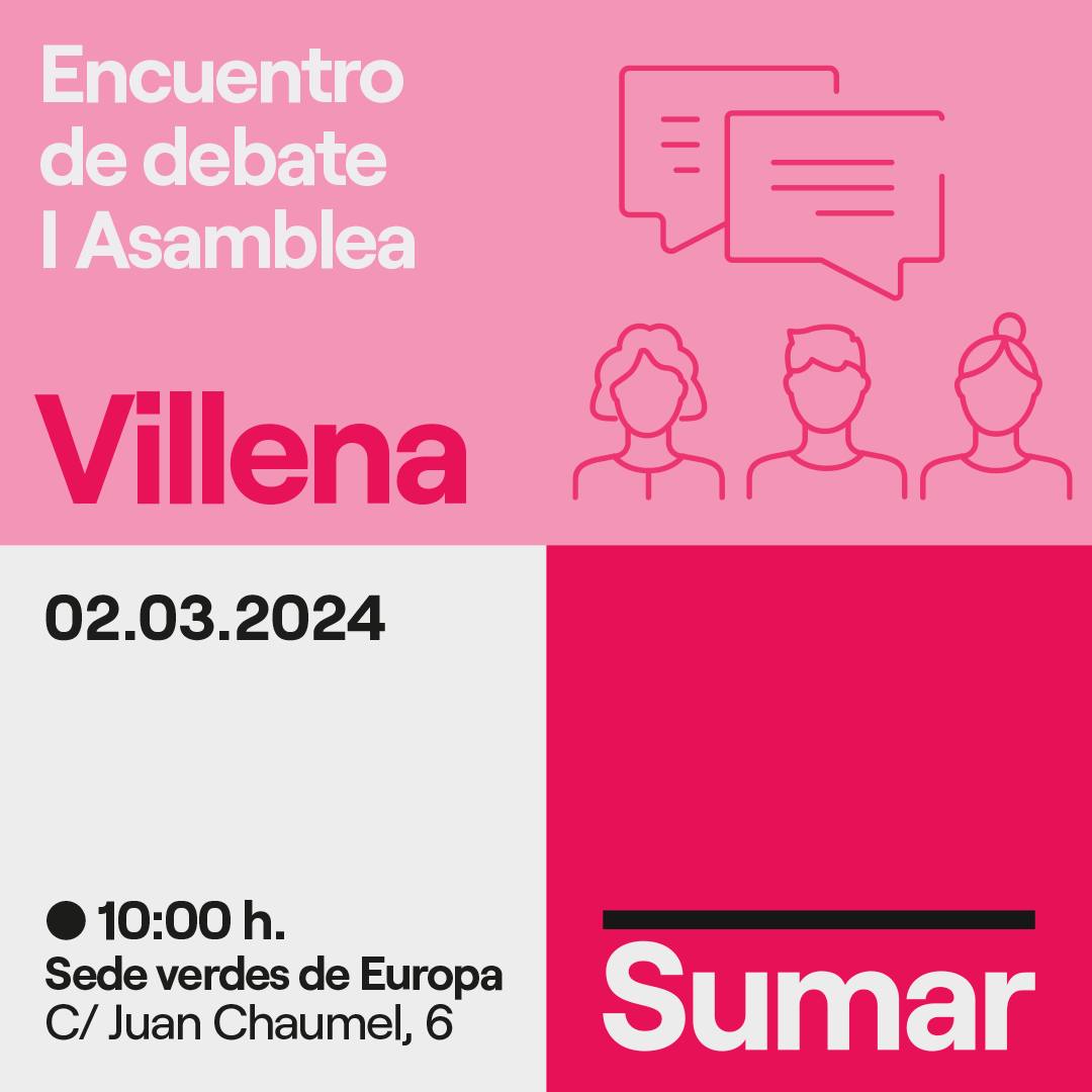 El sábado 2 de marzo a las 10:00h de la mañana, se organizará un debate abierto a la ciudadanía y simpatizantes de Sumar en Villena y localidades vecinas con el objetivo de debatir el proyecto de Sumar, acompañando a otros 3 lugares en la provincia (Orihuela, Elche y Alicante) donde se realizarán estos encuentros. De cara a la I Asamblea de Sumar que se realizará en marzo y que aprobará los textos definitivos que guiarán el camino de Sumar de Yolanda Díaz, los asistentes a estos actos están invitados a hacer propuestas de modificación de los textos propuestos (ponencia organizativa, ponencia política y ponencia de código ético) que han sido aprobados provisionalmente y se pueden encontrar en la web www.asambleasumar.es .