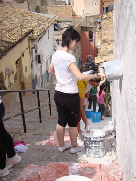 Fue una jornada festiva, que comenzó con un almuerzo en la explanada de la subida de Santa Bárbara, donde se divisan las angostas calles del Rabal, que más tarde, brocha y cubo en mano cambiarían su color. Había que coger fuerzas para emprender el trabajo. Fue una labor amena, de intercambio de impresiones entre los participantes sobre cómo utilizar la brocha, cuánta cal echar y, sobre todo, de experiencia, aprendizaje y sensibilización con esta zona de la población.