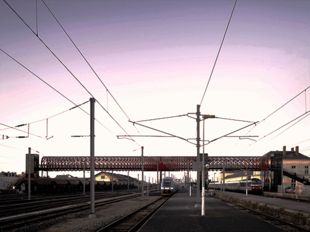Alzado esquemático de paso peatonal elevado mediante pasarela accesible ubicado donde actualmente se encuentra el paso a nivel.