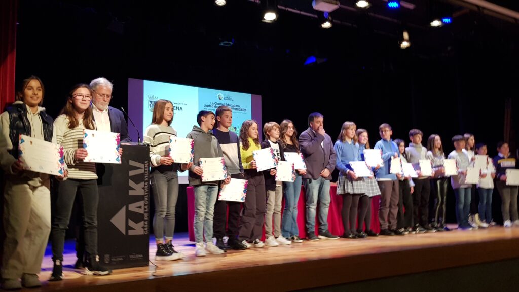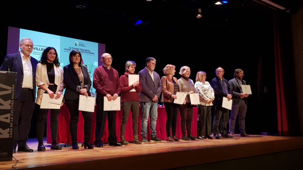 Villena ha reconocido el trabajo que desempeña la comunidad educativa en el acto conmemorativo del Día Internacional de las Ciudades Educadoras. Así se han entregado ocho reconocimientos a personal del mundo educativo, seis de ellos docentes, y a 22 alumnos con mejores expedientes académicos que han recibido de la Generalitat también se ha puesto en valor a la Asociación de Familiares del Alumnado del CEIP Santa Teresa o al centro Apadis, por su documental ganador