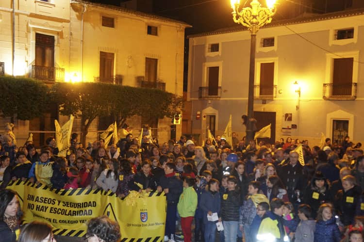 El frío no fue obstáculo para que un millar de vecinos hayan salido a la calle para reclamar una educación de calidad en el colegio Príncipe Don Juan Manuel de Villena. De este modo se han unido a la manifestación convocada por el AMPA del centro para pedir de forma contundente que las obras de adecuación del centro comiencen de forma urgente y se garantice la seguridad de los alumnos, que día a día acuden a un colegio con zonas apuntaladas y espacios inhabilitados por motivos de seguridad ante el riesgo de derrumbe.