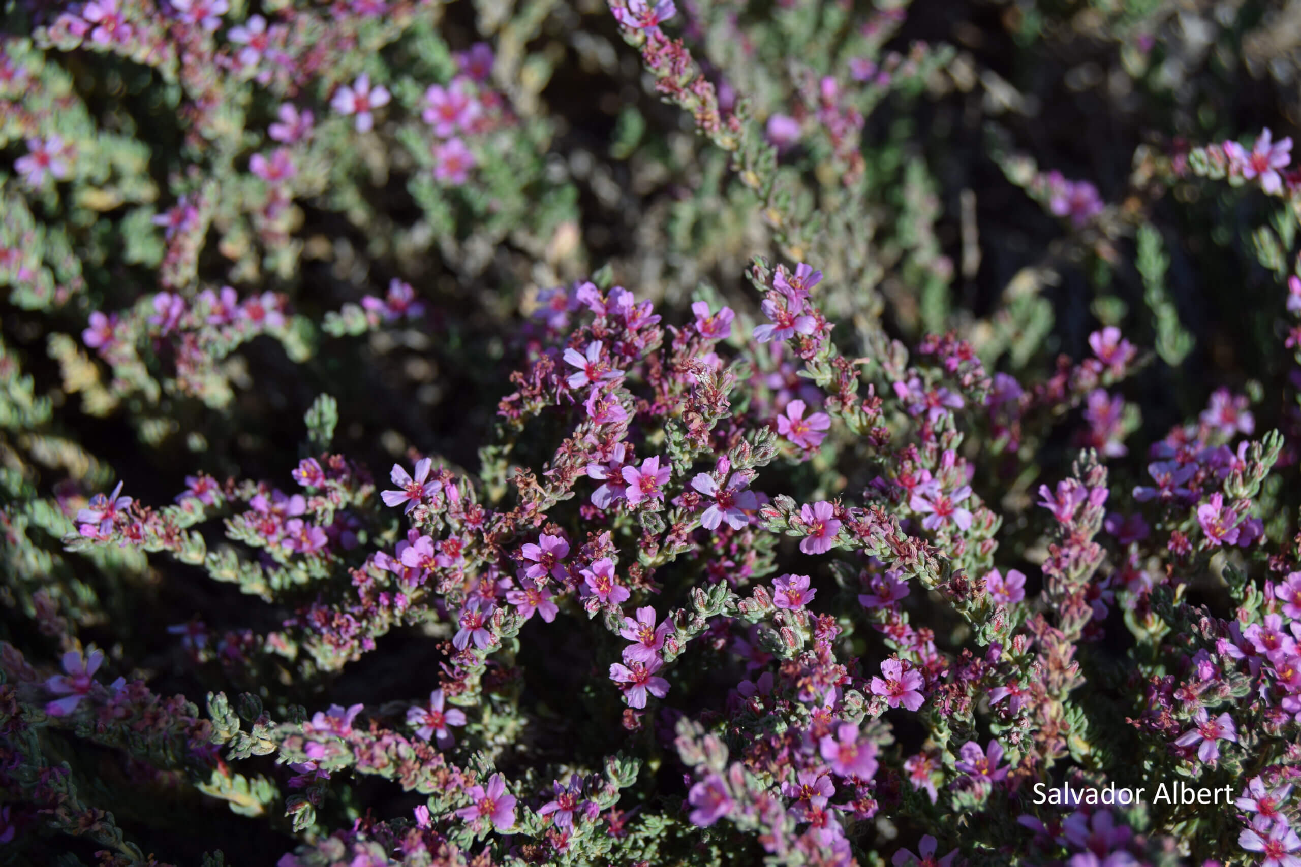 Entre las plantas que tienen esta particularidad se encuentran los “tomillos saperos”, nombre que reciben algunas especies perennes del género Frankenia L. En nuestro municipio podemos encontrar dos diferentes. La primera, F. corymbosa Desf., muestra una distribución peninsular que se reduce al sureste ibérico, siendo muy frecuente en el litoral del sur de Alicante, Murcia y Almería; la segunda, F. thymifolia Boiss., es una especie continental que se encuentra en los yesos del sur de Madrid, Cuenca, Zaragoza y la Hoya de Baza; es decir, que procede del interior de la península. Ambas especies confluyen en estos saladares villenenses, porque Villena es una tierra de frontera y en las plantas también se demuestra… pero esto no es excepcional, pudiendo encontrarse otras plantas que tienen en nuestro territorio su límite desde el interior hacia la costa, y viceversa, y que se encuentran conviviendo aquí.
