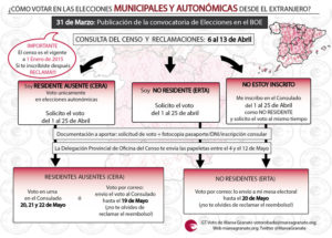 Ahora, que aparte de los límites legales al voto, existen los formales, los que aparecen en la práctica. La experiencia de las pasadas elecciones (locales y autonómicas de 2011, generales, europeas), es fatídica: votos rogados (solicitados) que se rechazan, un montón de personas que ni se molesta en rogarlo, problemas de cómo atender las solicitudes desde algunos consulados, las papeletas de voto no llegan a tiempo … dejando la participación entre un 5% y el ¡1,84%! de las elecciones europeas de 2014.