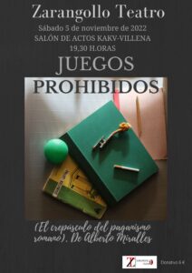Después de la reposición de la “Dama del alba en el teatro Chapí” y de “Estrecho” en la Casa de la Cultura de Villena, volvemos a ponernos frente al público para representar la obra “El crepúsculo del paganismo romano” o lo que es lo mismo JUEGOS PROHIBIDOS.
