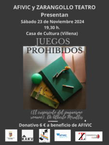Reponemos la obra “Juegos prohibidos” de Alberto Miralles. Esta vez en la Casa de la Cultura de Villena y a beneficio de la Asociación de Fibromialgia de Villena y Comarca (AFIVIC)